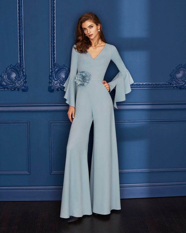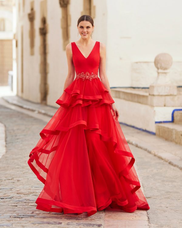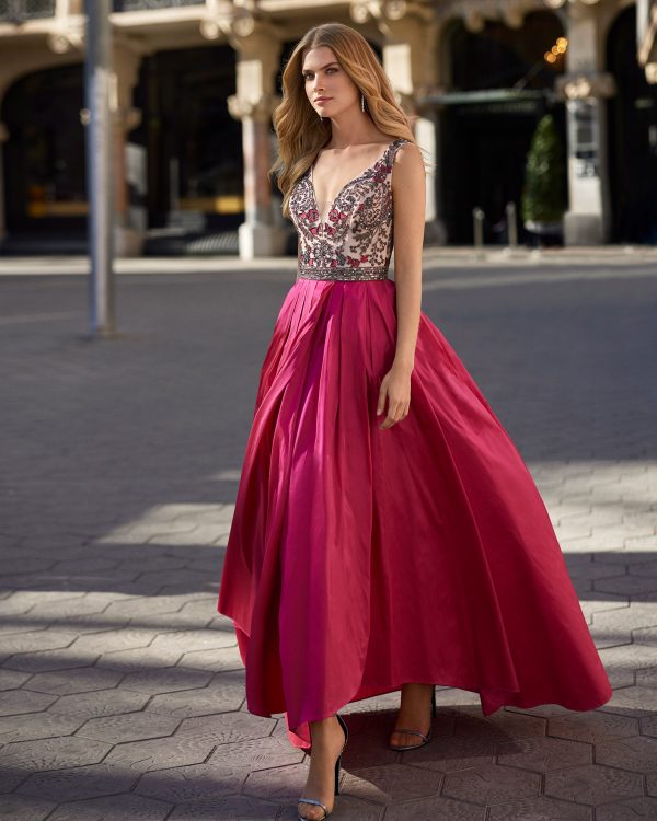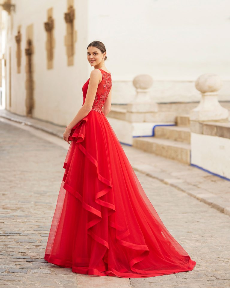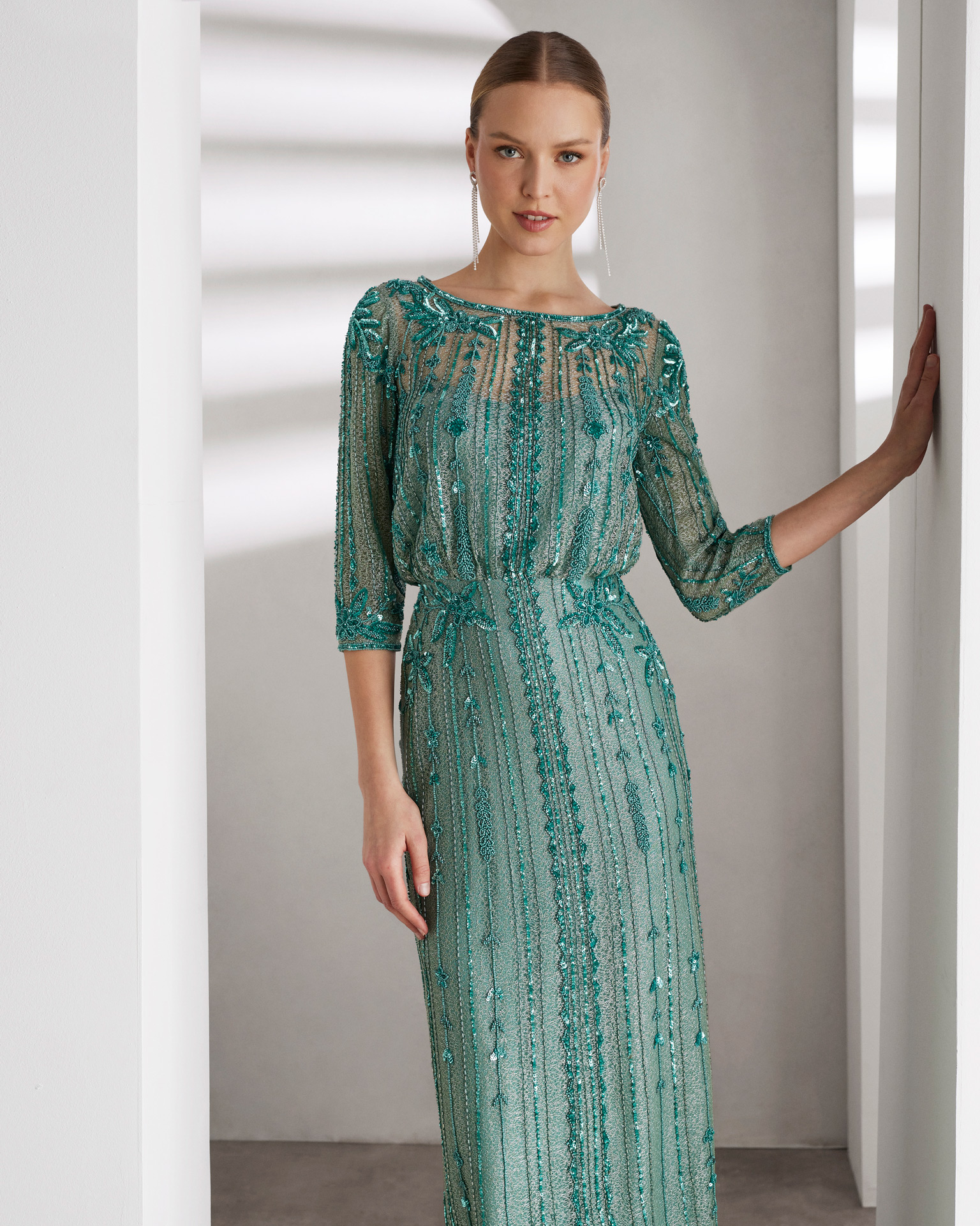 Rochie de seară lungă, elegantă, de tip teacă, confecționată cu mărgele. Prezintă un decolteu tip bateau, spate în formă de lacrimă și mâneci trei sferturi. Un look cocktail Rosa Clará.