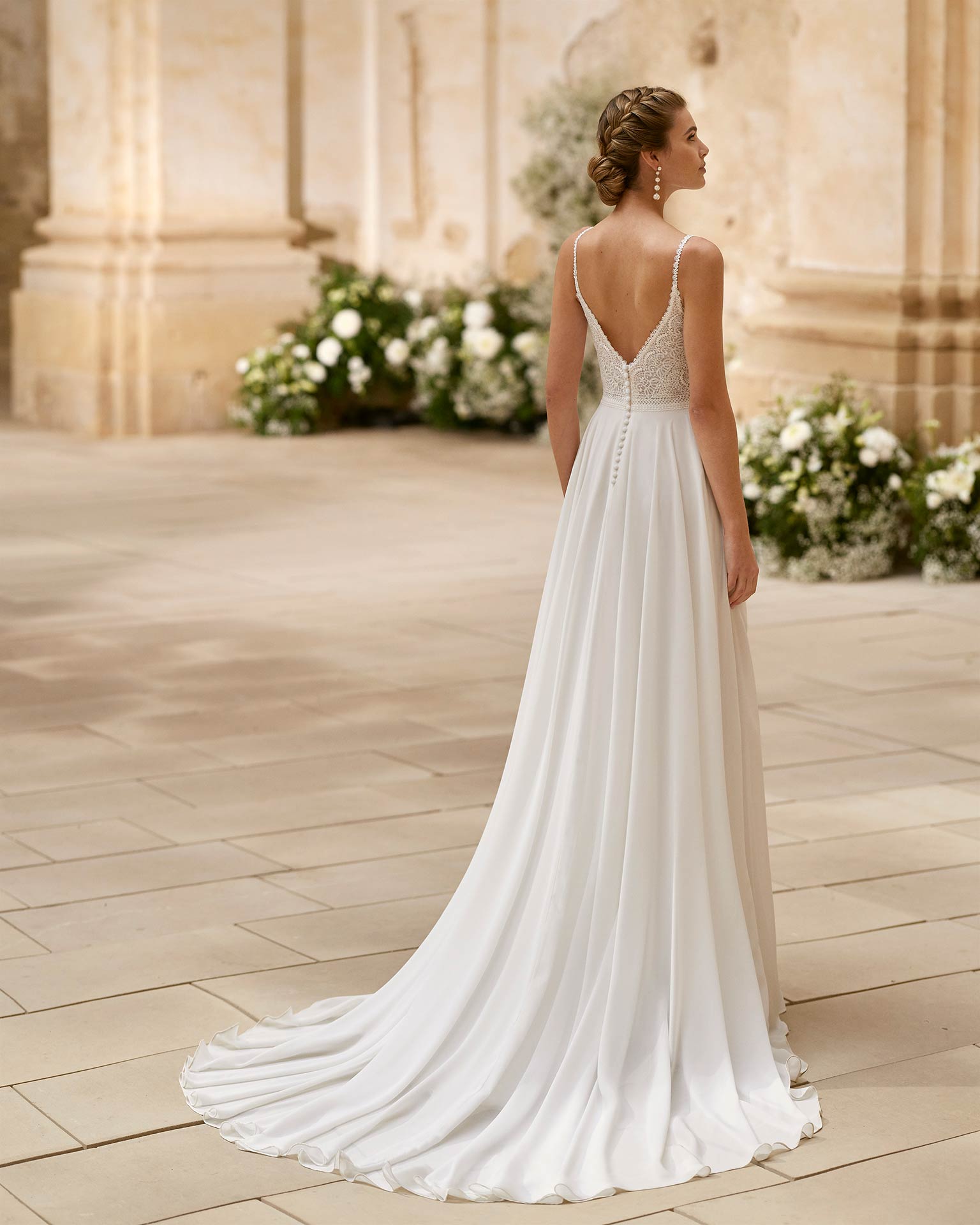 Rochie de mireasă prințesă lungă din două piese, în linie A, realizată din georgette cu detalii din dantelă. Cu decolteu în V, spate în V și pelerină din georgette. Prezentați un set elegant, Alma Novia