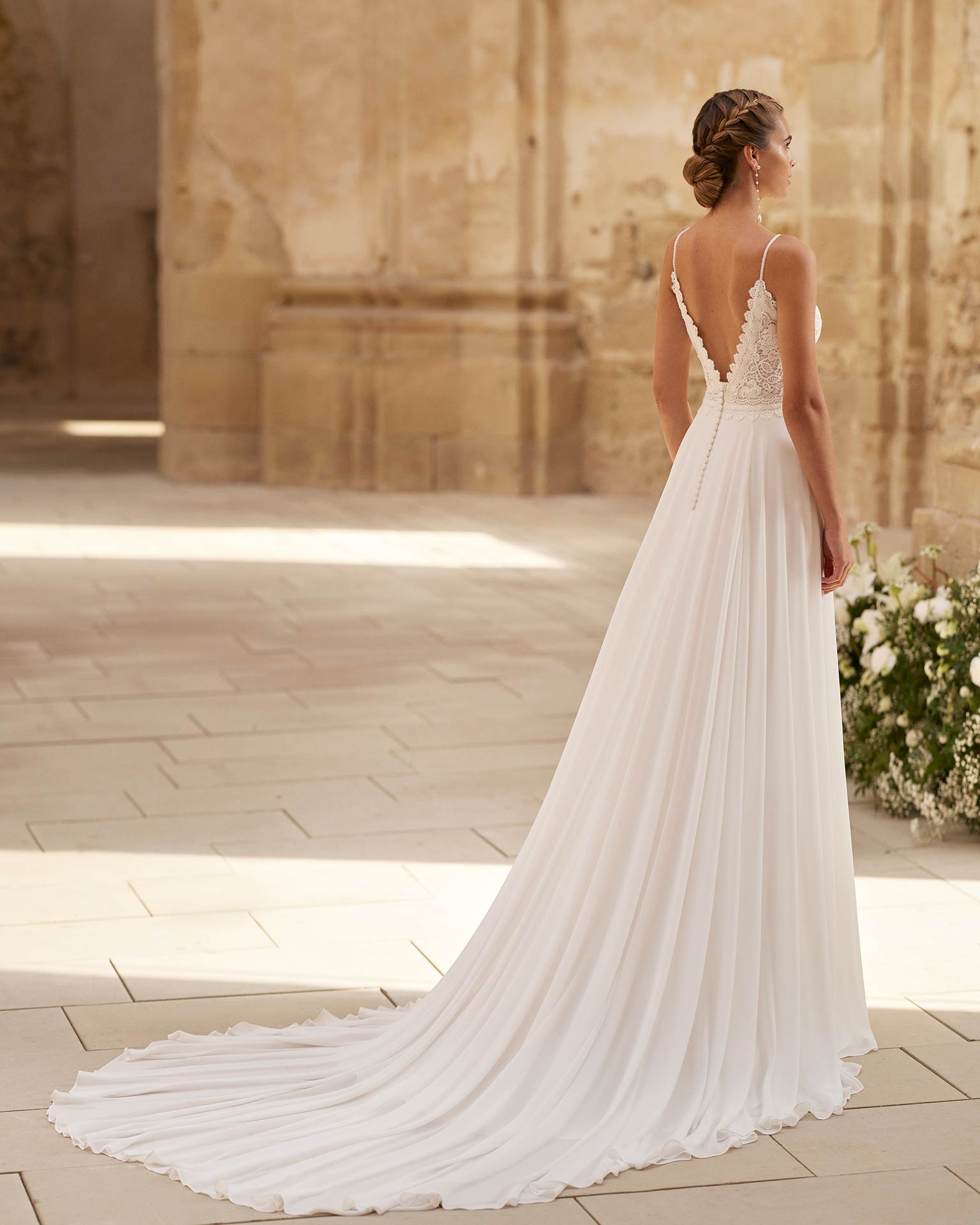 Rochie de mireasă, lungă, în linie A, realizată din georgette, împodobită cu dantelă guipură. Cu decolteu în V atat in fata cat și in spate. Prezintă un design exclusiv Alma Novia