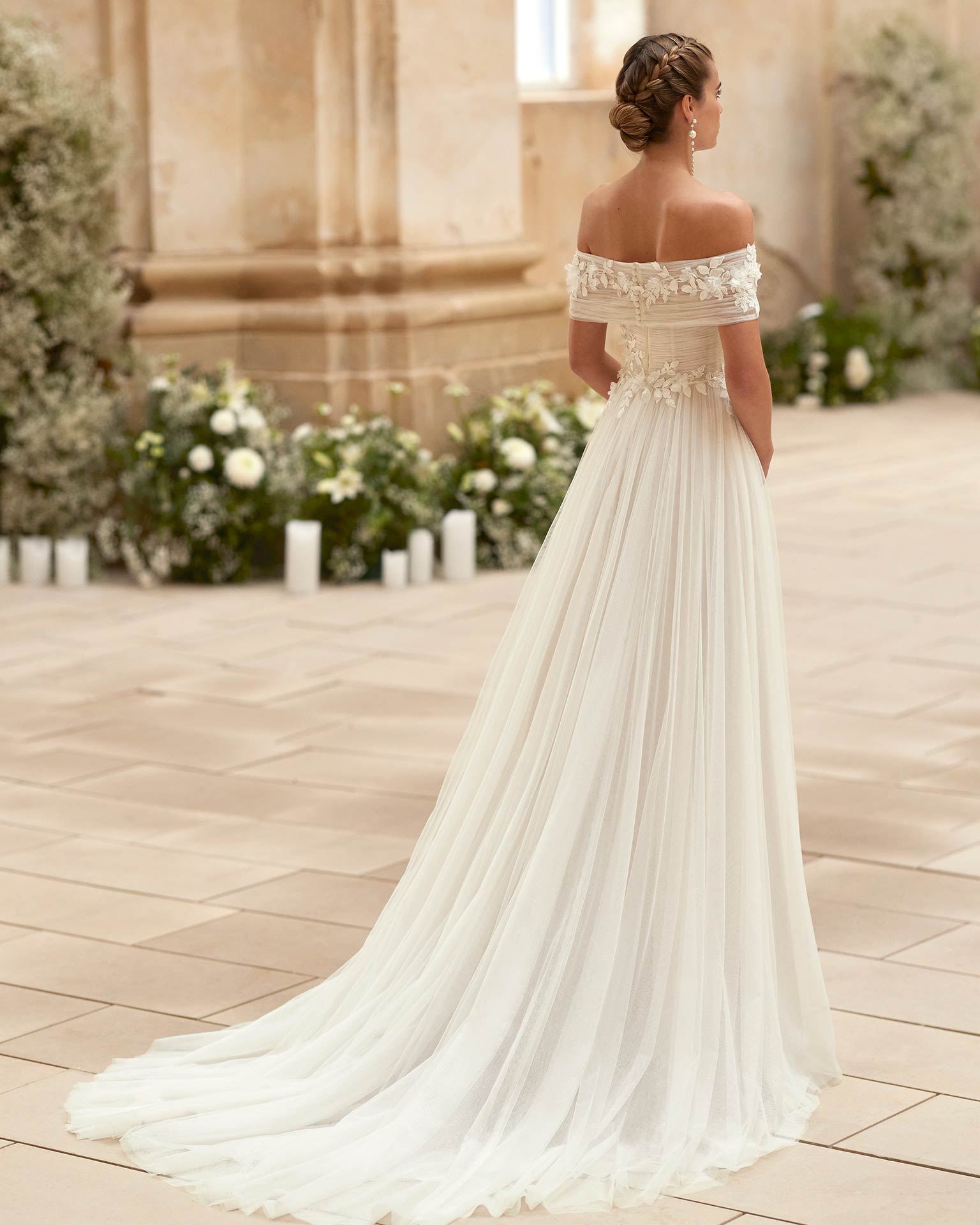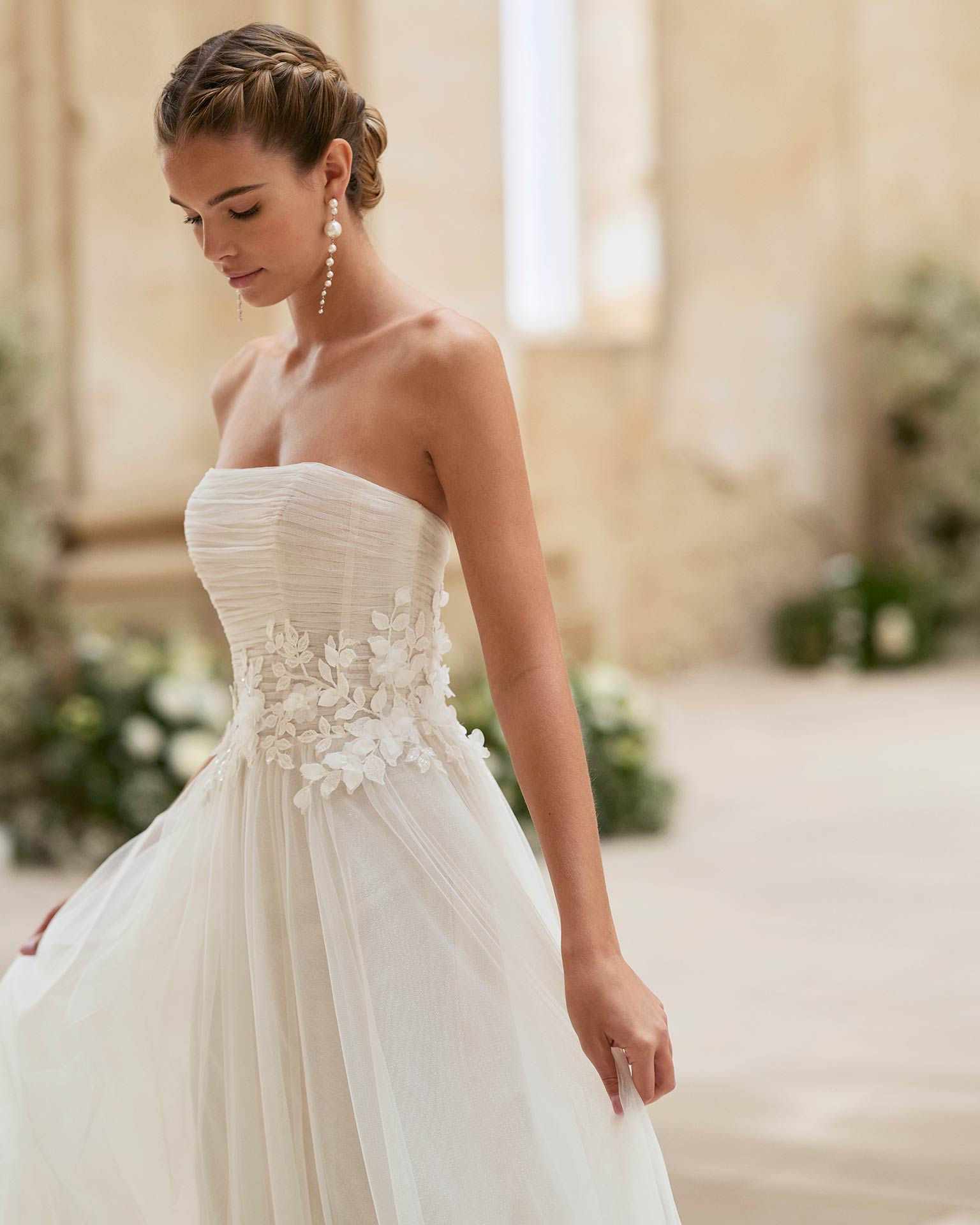 Rochie de mireasă elegantă, lungă în două piese, în linie A, realizată din tul cu detalii din dantelă. Cu un decolteu fără bretele, combinat cu măiestrie cu un decolteu detașabil la manșetă din tul. O ținută exclusivă Alma Novia.