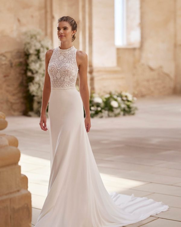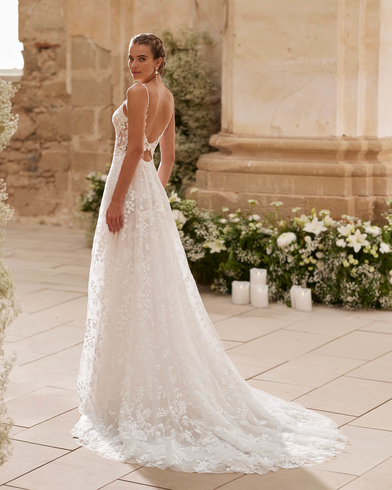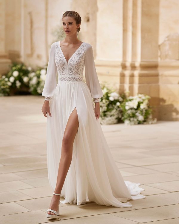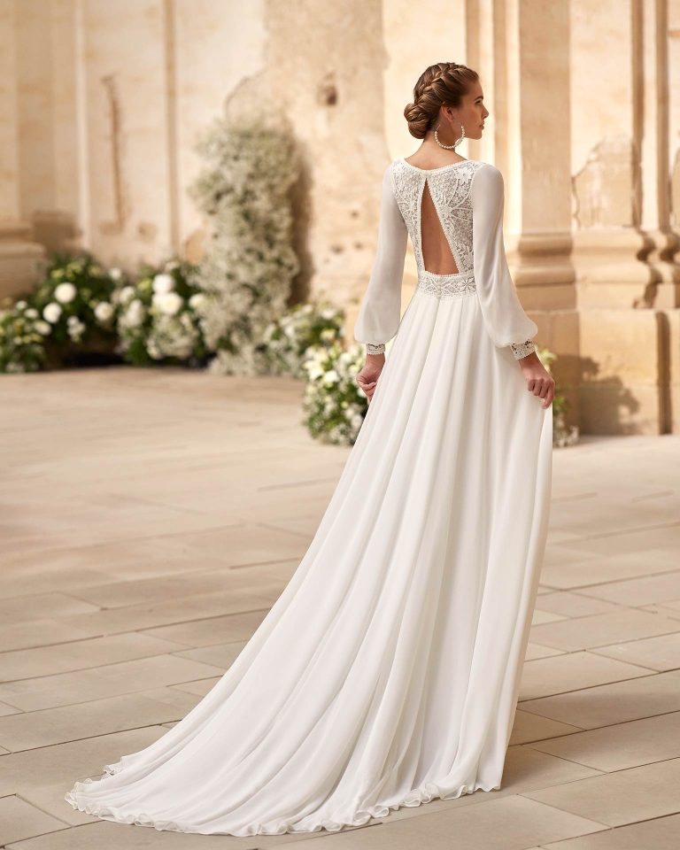 Rochie de mireasă lungă în linie A în stil fantezie. Confecționată din tul combinat cu dantelă, are decolteu în V și spatele deschis. O ținută exclusivă Alma Novia.
