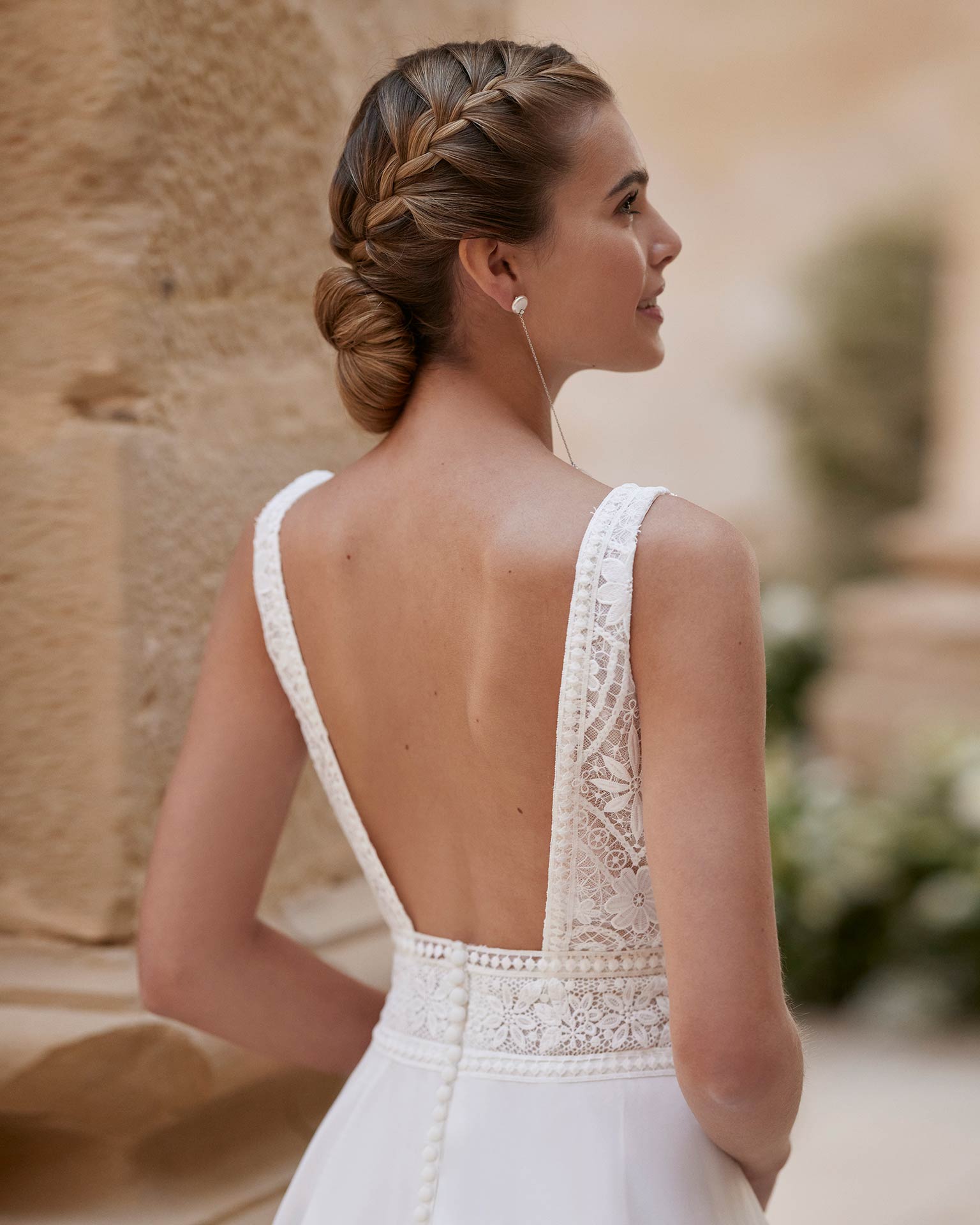 Rochie de mireasă elegantă, lungă, în linie A, realizată din organza și dantelă. Cu decolteu în V și spate pătrat. Un design exclusiv Alma Novia.