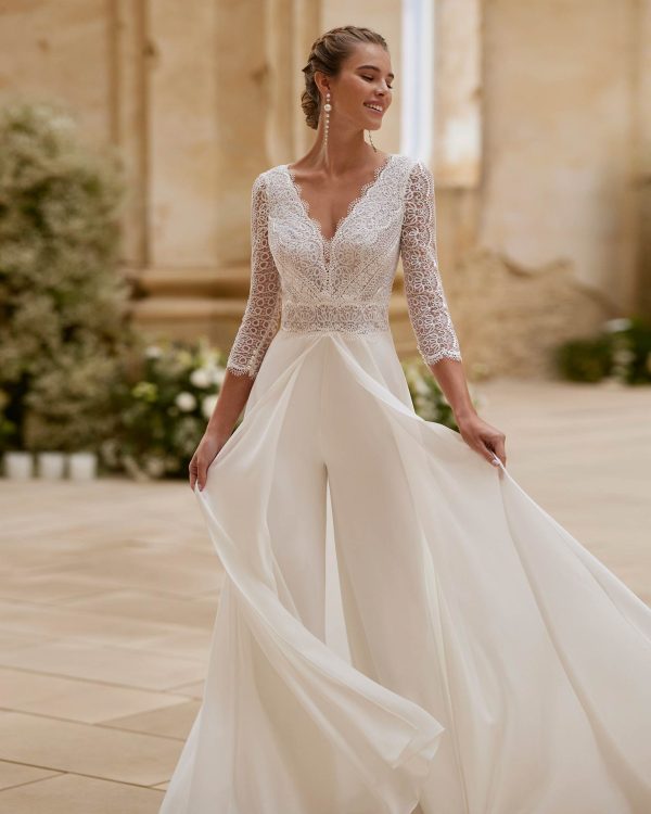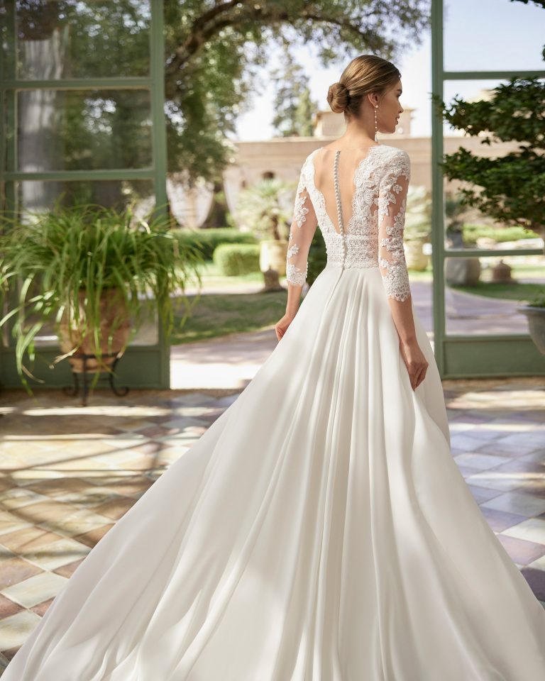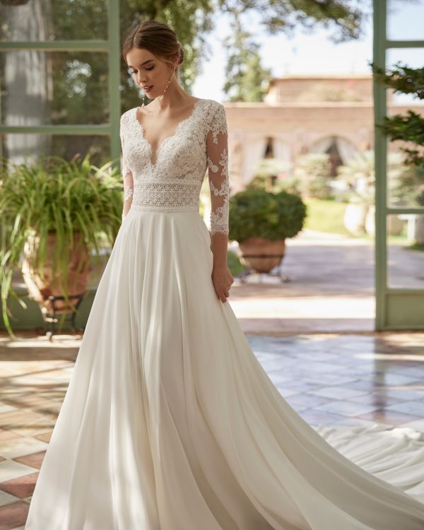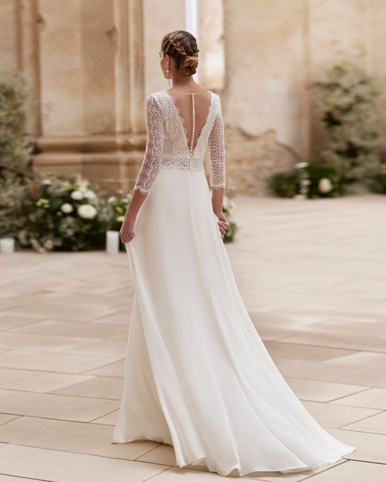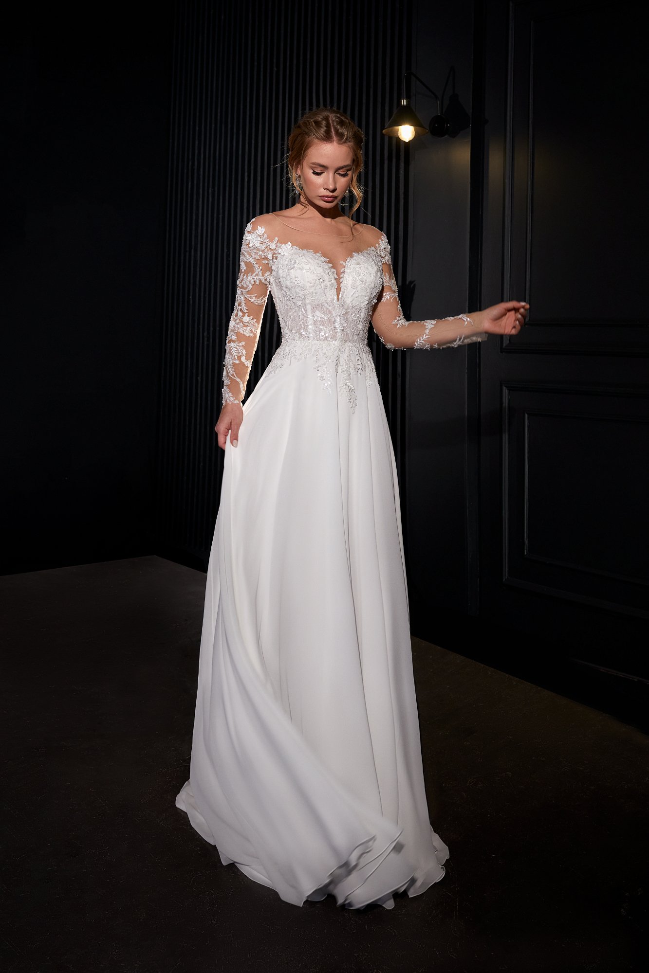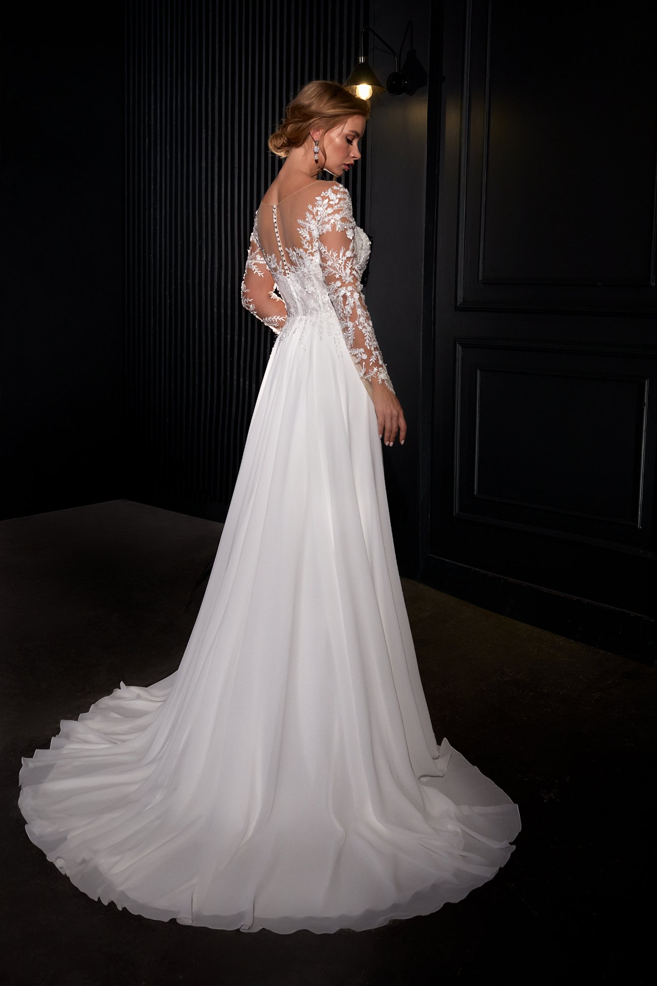 Rochie de mireasă lungă. Fabricata din georgette cu detalii din dantelă brodata, paiete si margele, are decolteu în V, spatele este inchis cu nasturi și mânecă lunga.
