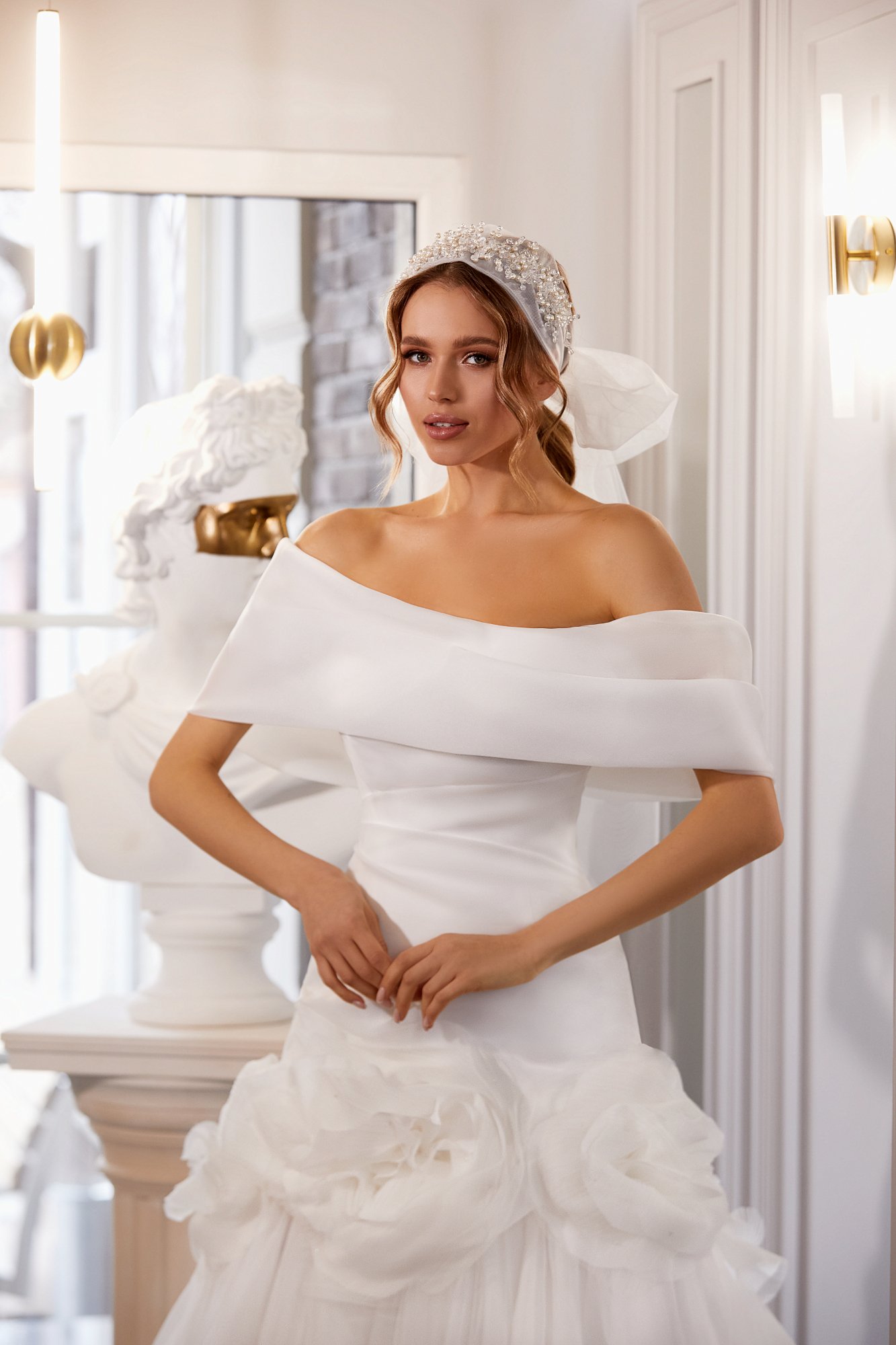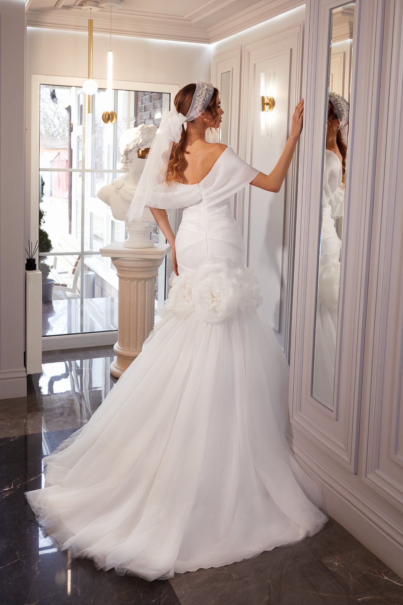Rochie de mireasă elegantă din organza, cu corset alungit si fusta umflată în jos. Închidere cu fermoar pe spate. Guler din organza drapat care cade pe mâini. Rochia este decorată cu flori mari din organza 3D și plisată.