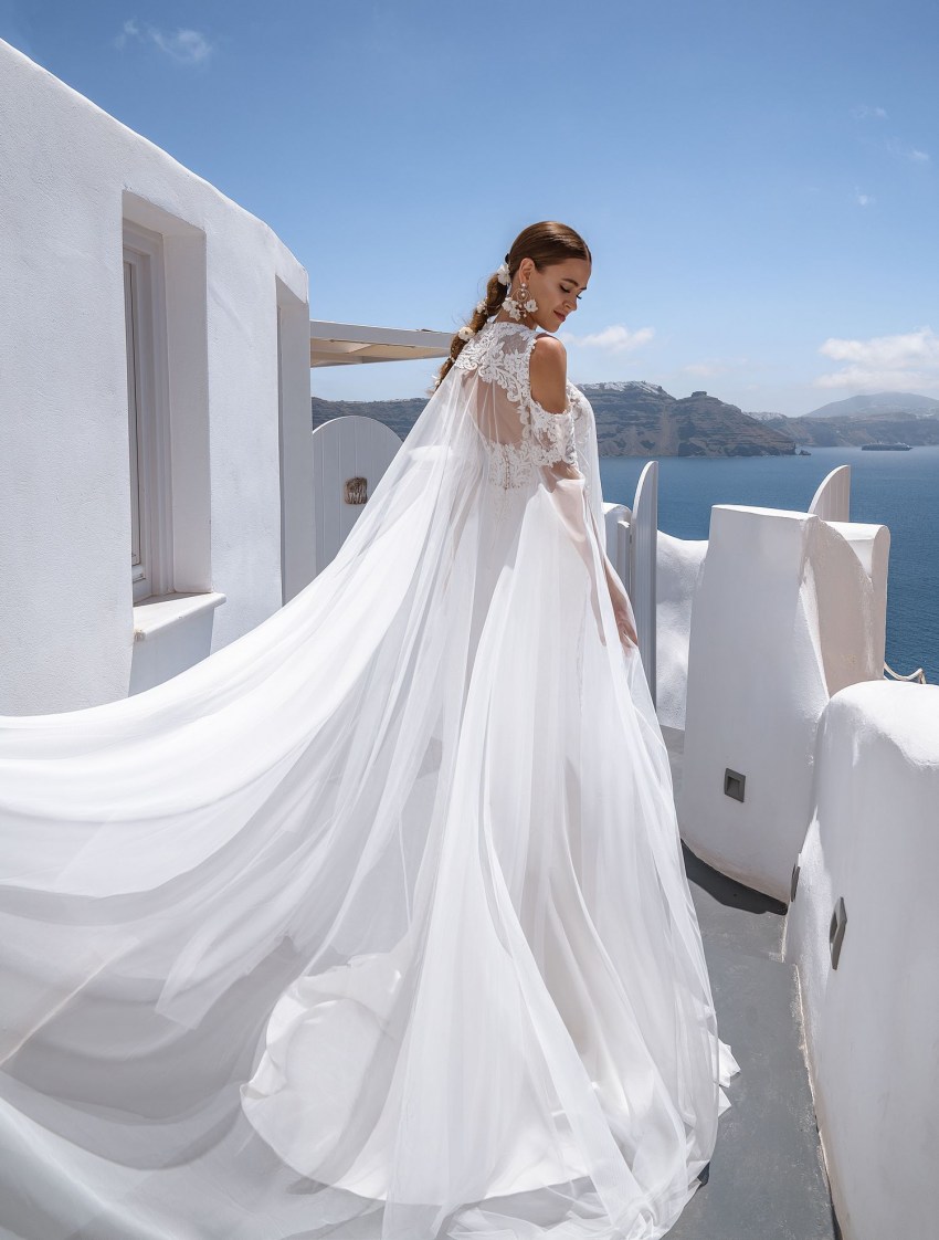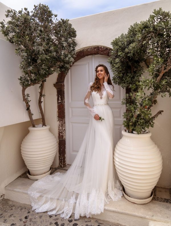 Set de nuntă lejer, care constă dintr-o rochie și o mantie aeristă cu mâneci. Corsetul translucid seducător al rochiei este pe bretele de culoare cremă. Tăieturile figurate pe părțile laterale ale fustei adaugă mai multă lejeritate rochiei, iar mantia face ținuta una foarte speciala.