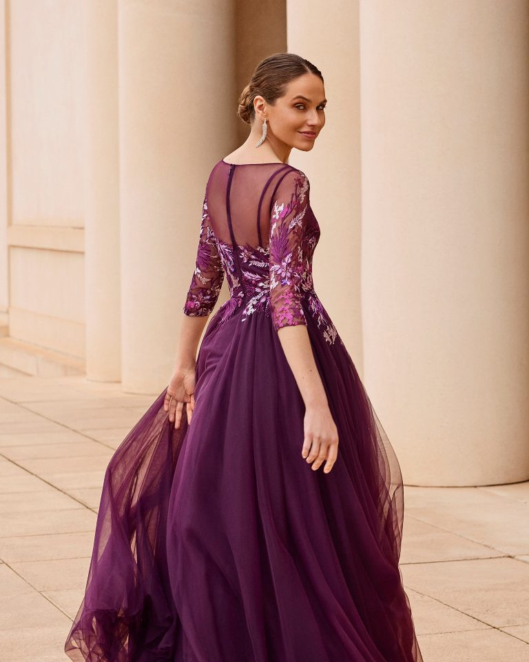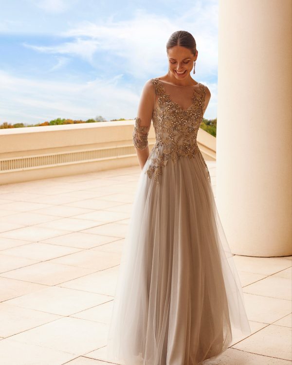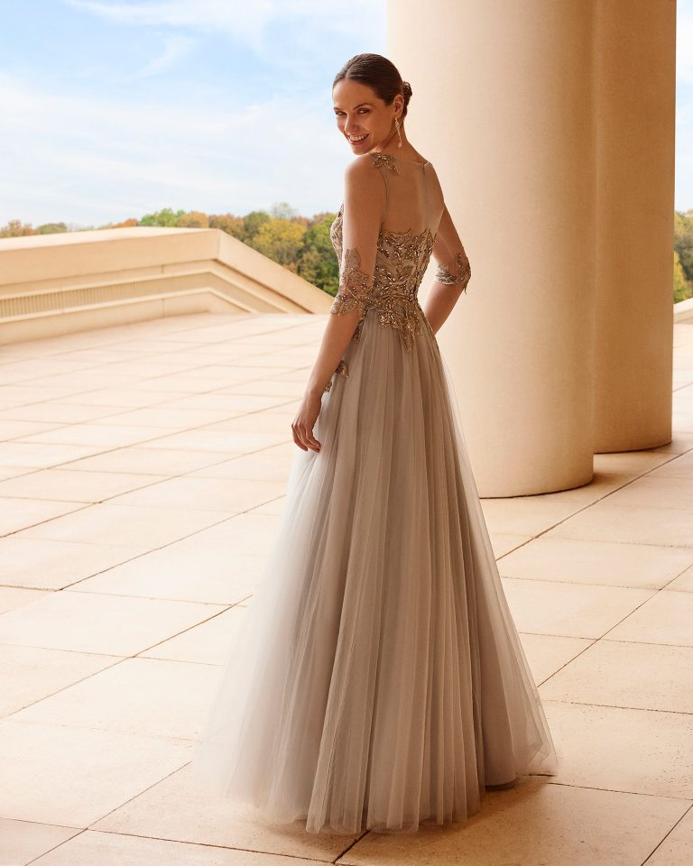 Rochie de seară din saten regal, cu bretele și fustă cu trenă. Corsetul până la talie. In fata și in spate decolteu în formă de V. Spatele se încheie cu nasturi. Fusta în straturi, cu buzunare pe părți. Rochia decorată cu elemente de ghipur, brodat cu paiete, mărgele și cristal.