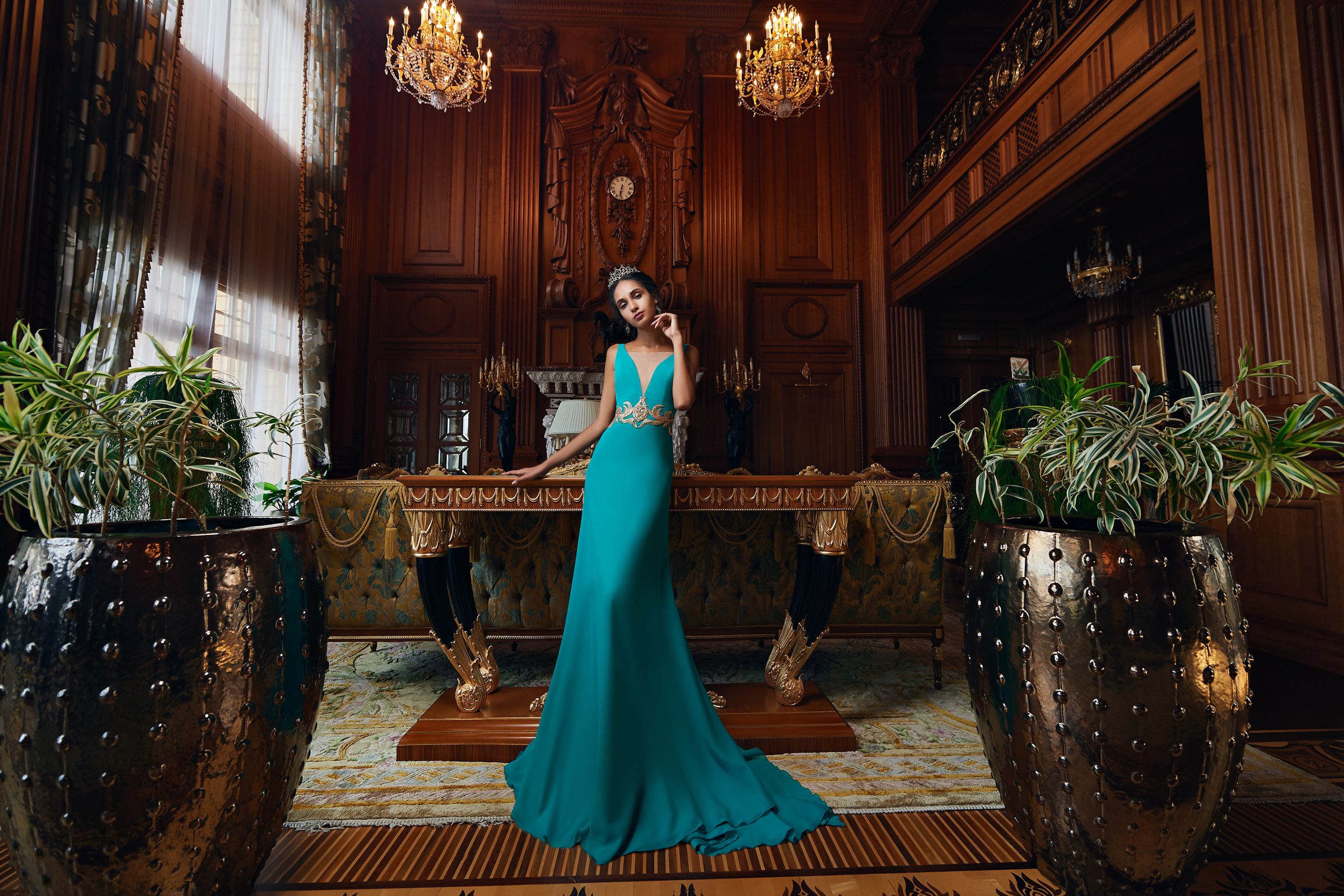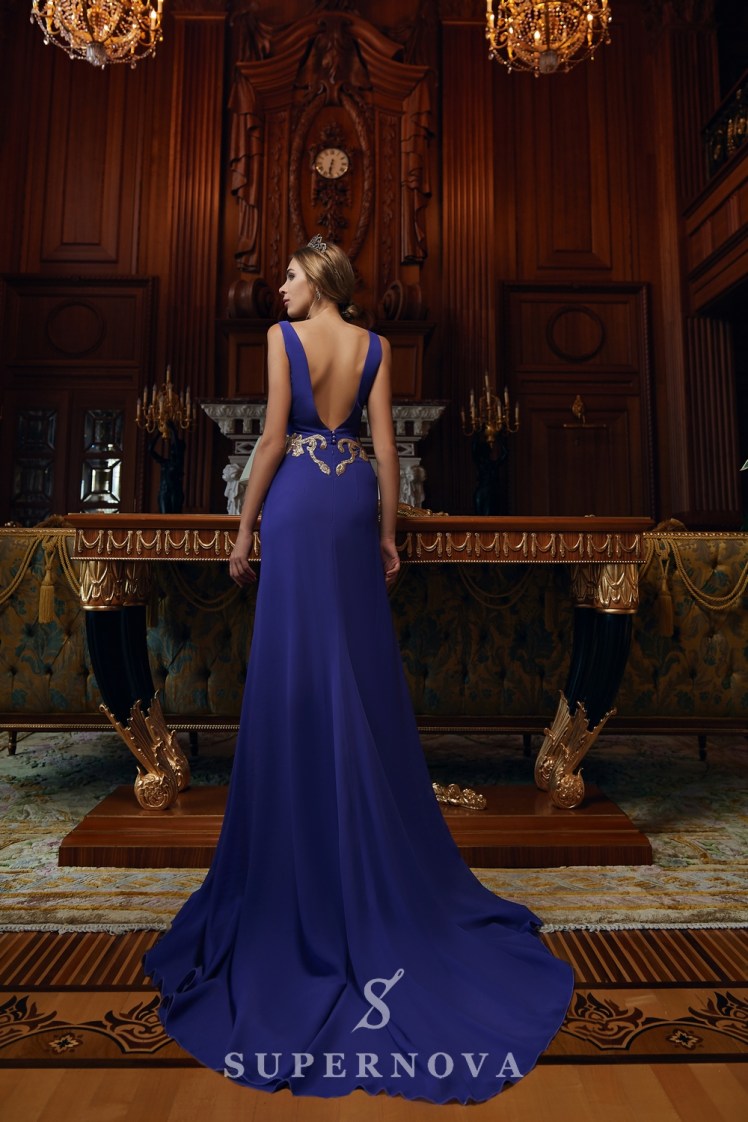 Rochia de seară cu bretele de siluetă „gode” din multi șifon cu trenă. Corsetul până la talie. In fata și in spate tăietură V. Spatele se încheie cu nasturi. Rochia decorată cu elemente de ghipur, brodat cu paiete aurite.